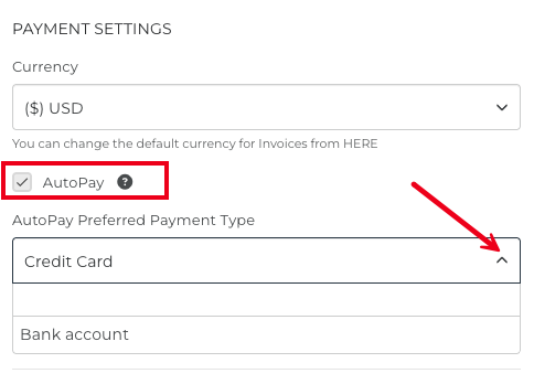 Payment Settings is where you can add your Currency, allow Partial Payments, disable Online Payments altogether or add a Third Party link. If you are using an integrated Gateway you do not tick the third-party link option but instead you select your gateway in the Available Gateway(s) section.