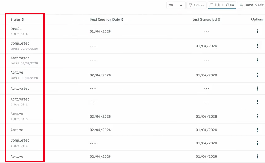 Generators that have reached their end condition display a Completed status and show --- in the Next Creation Date column.