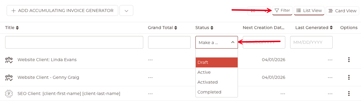 You can also create a Dynamic Accumulating Invoice Generator. Instead of having to create an Accumulating Invoice Generator for each Client, you can assign it via Automations or a Kickoff Form.