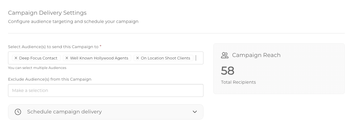 As you add your Audiences, the total number of recipients will be shown in the Campaign Reach.