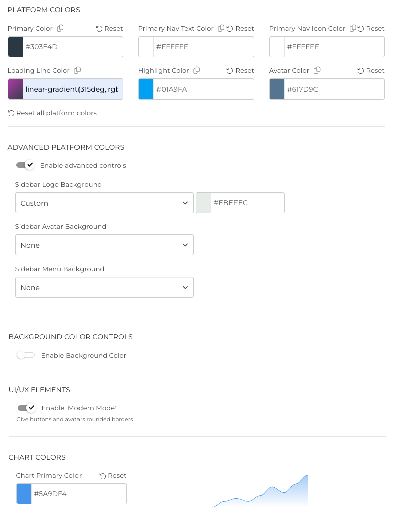 Platform Branding is the process of customizing the platform with your preferred colors, logo, and settings.