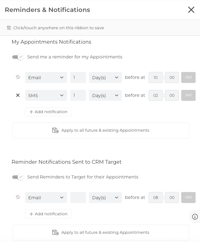 In addition to personal Notifications, Super Admin and Admin Roles are also able to set Appointment Notifications/Reminders to go to the Target of an Appointment.