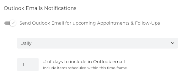 Choose Daily or Weekly, the day of the week to receive the email (Monday for example, to see what's ahead), and # of days to include in Outlook email.