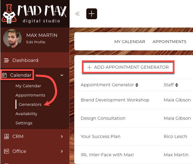 To get started, navigate to Calendar > Appointment Generator, and click +Add Appointment Generator.