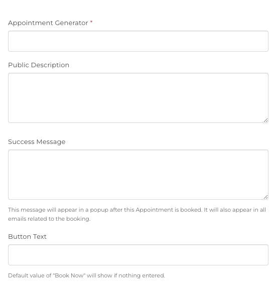 Appointment Generator (formally Appointment Type) is the category of appointment you create, and make available for Contacts to select while booking an Appointment. For example, you can have a "Consultation" Appointment Generator for new Contacts, a "Skills Training" Appointment Generator for more established Contacts, and more. You can have any number of different Appointment Generators so that your Appointments can serve different purposes.