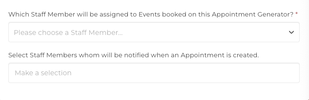 You can choose which Staff Member will be assigned to the booked Events on the Appointment Generator, and can optionally select other Staff Members to receive a notification when a booking is created.