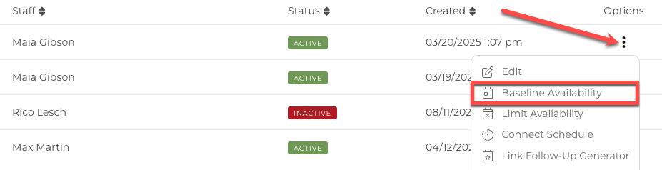 To set an Individual Availability for an Appointment Generator, navigate to Calendar > Appointment Generator. Then select Baseline Availability from the Options menu button.