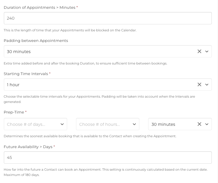 These settings control the duration, padding, intervals, and cut-offs related to your Appointment Generator. When an Appointment is being scheduled, the Time Slots that are available to choose from will be based on the combination of these settings.