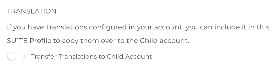 While creating a SU1TE Profile, you have the option of copying your entire current Translation set and transferring it over to the Child account.