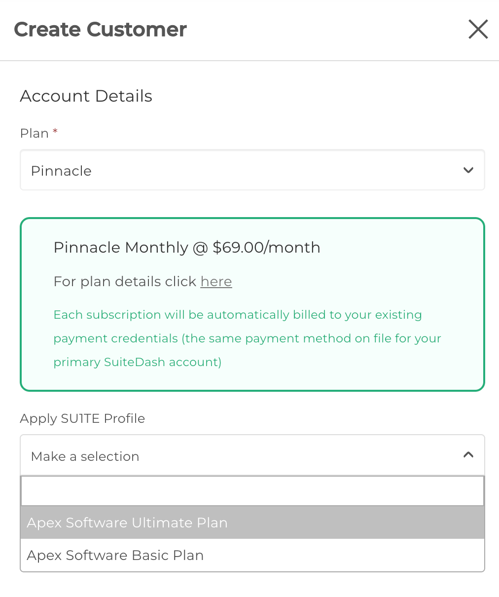 In the Customer creation window, you will be able to select a Profile in the SU1TE Profile dropdown menu.