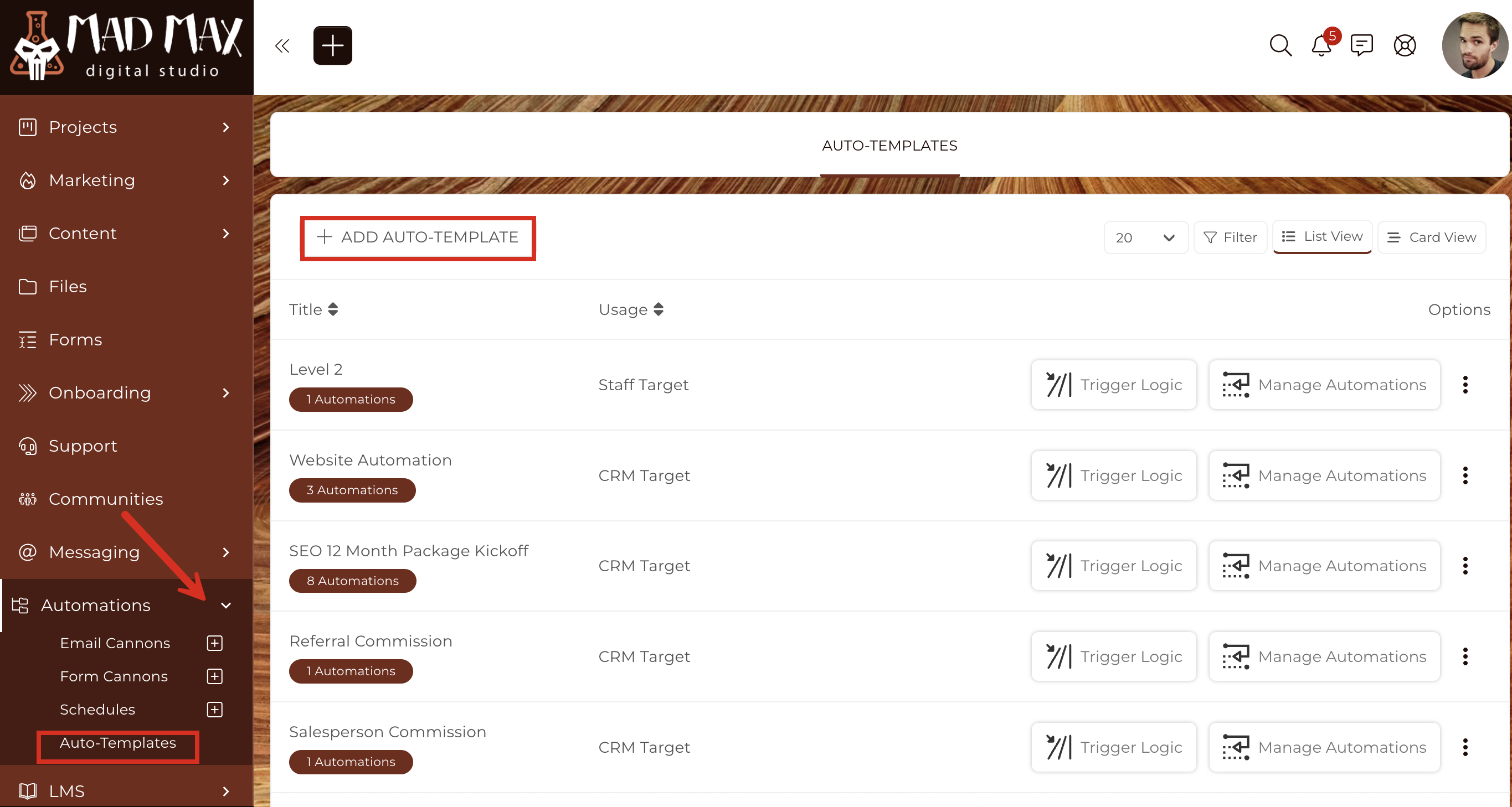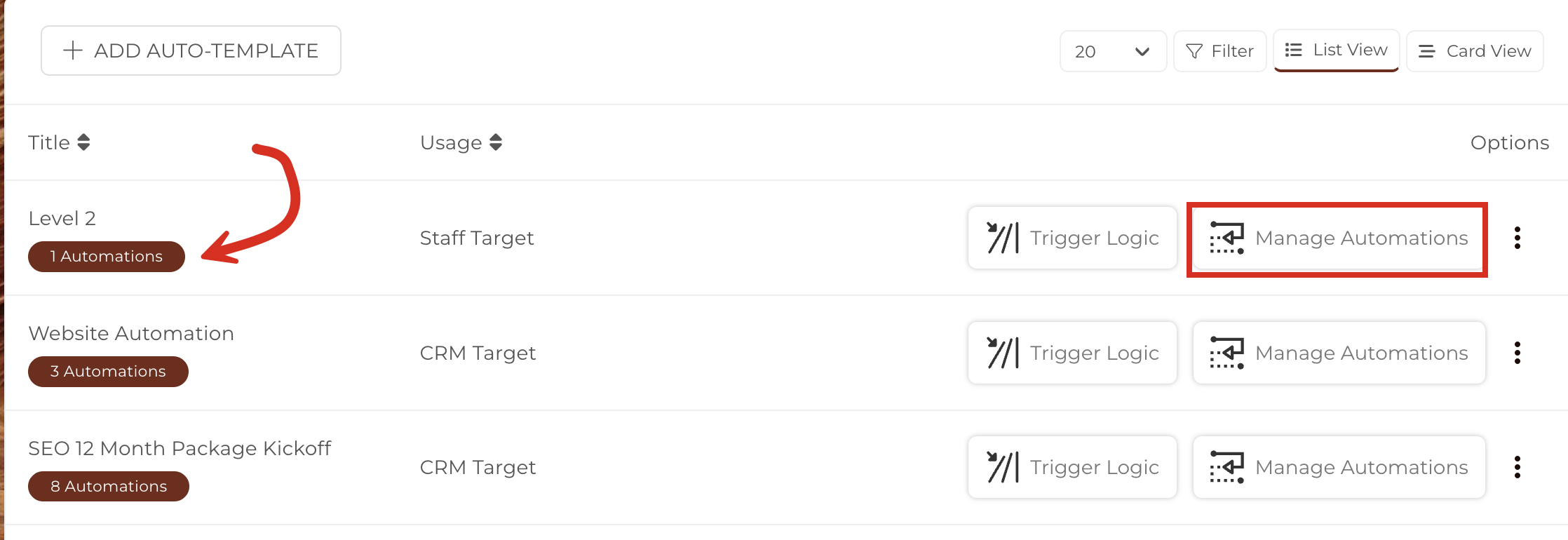 Once it is saved your Auto-Template will appear on the list. The List View gives you a quick look at how many Automations are in each Auto-Template you have.