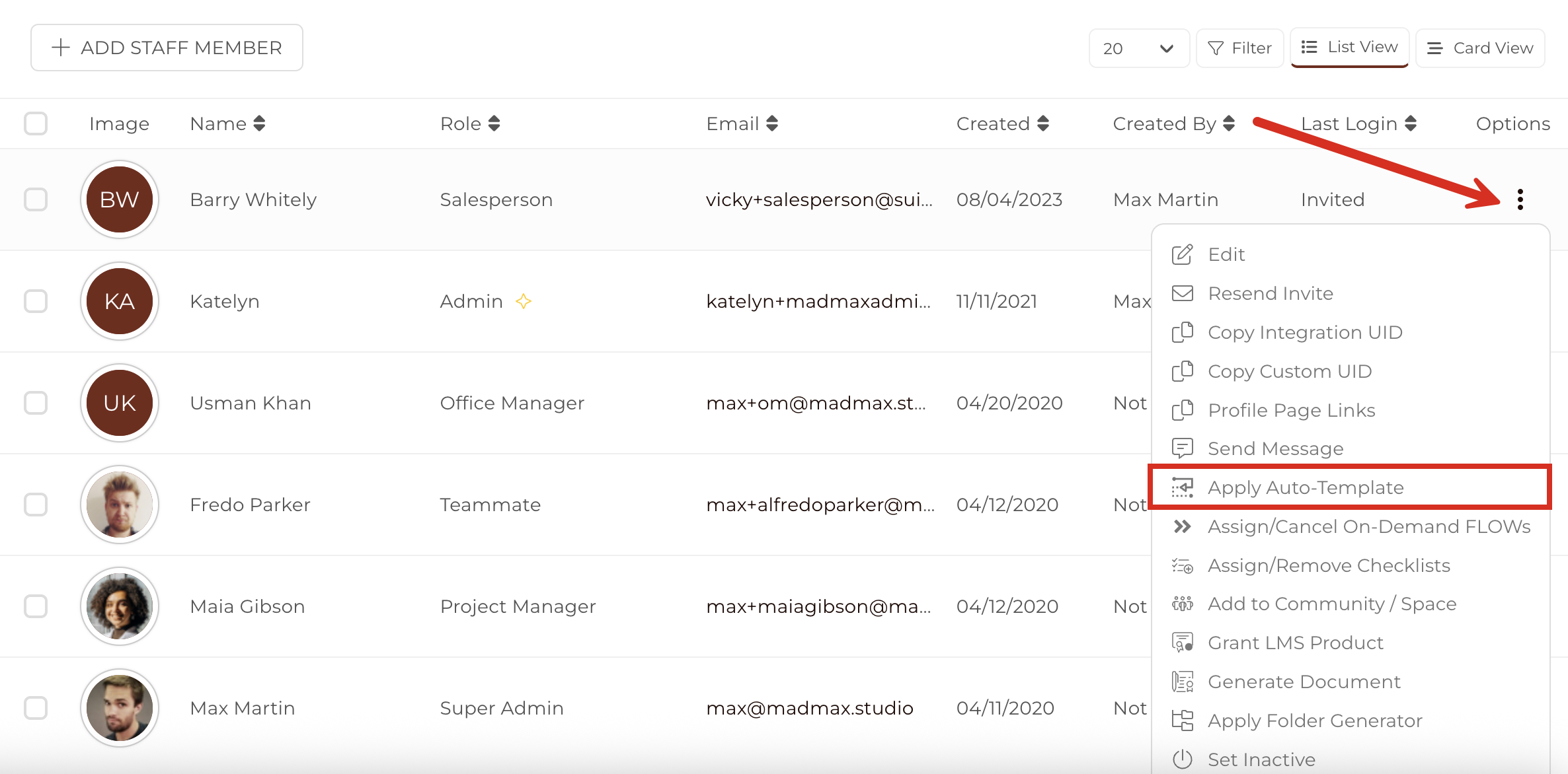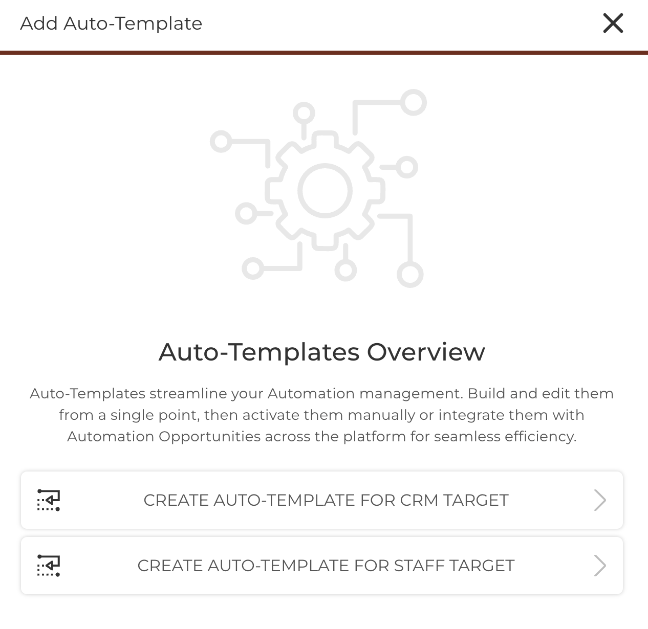 An Auto-Template is a pre-configured set of Automations you can build and save for use with CRM Targets or Staff members. You can then reference them manually or use them in an Automated Workflow.