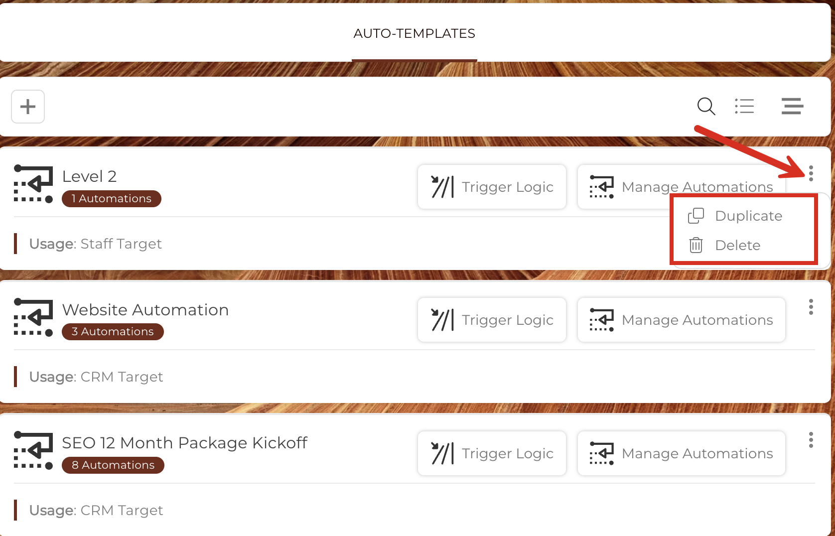 While in Card View or List View if you click the three dot options menu, you can Duplicate your Auto-Template or Delete the Template.