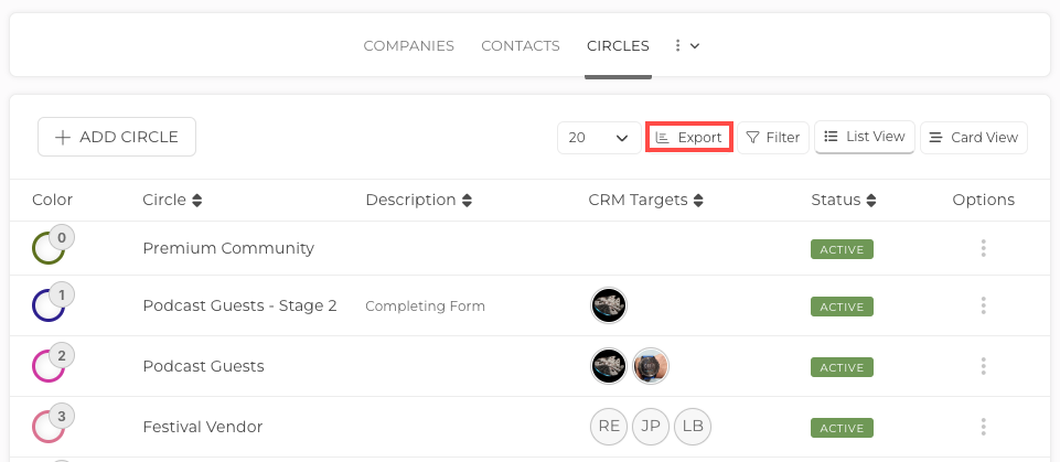 The Export function allows you to export your Circle List. Once an export is initiated, you can then download the CSV file.