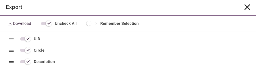 You can export the UIDs, Circle Names and Circle Descriptions but you can also un-toggle any of these options if you do not want to export them.