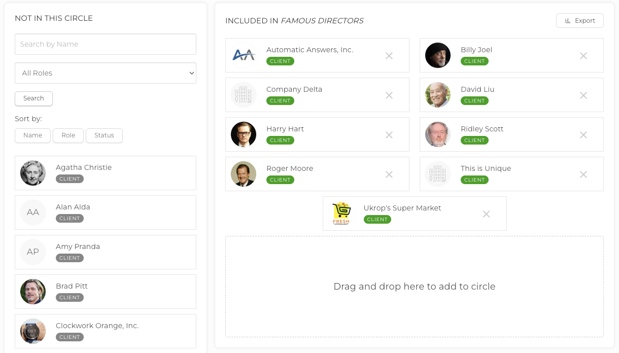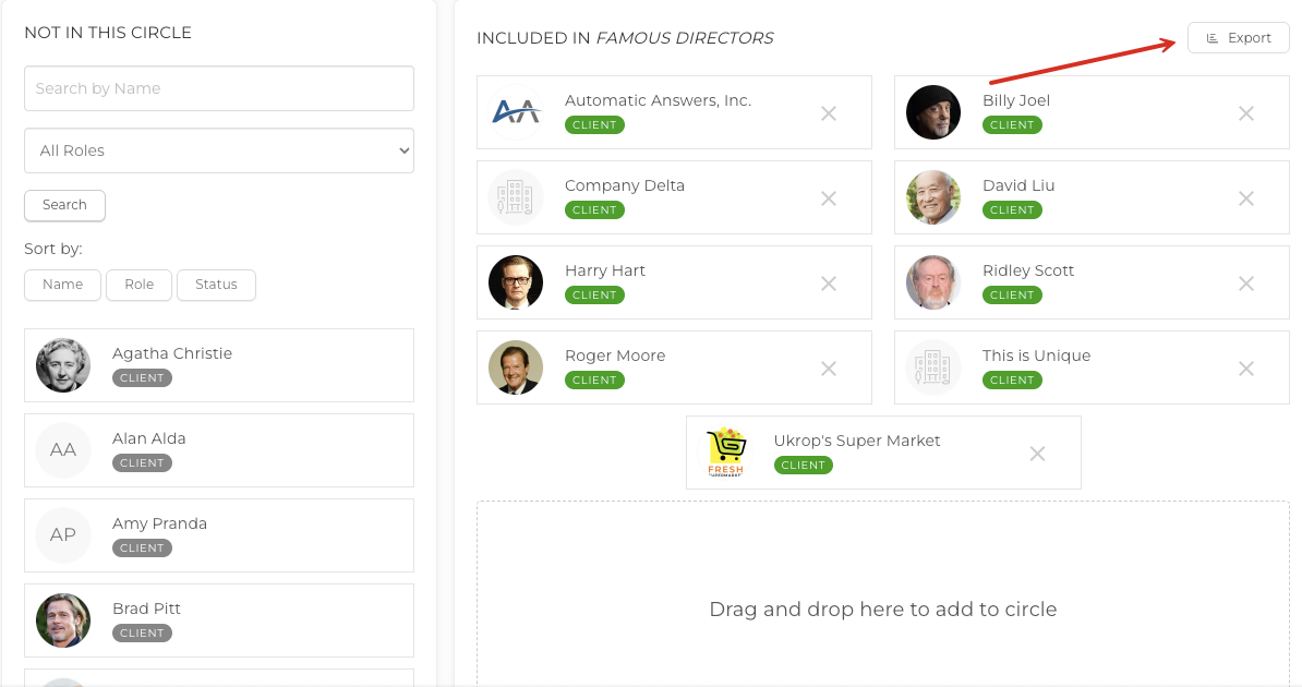 Manage Circle: This will bring you to an in-depth view of the Contacts included in the Circle. The column to the left is a list of all Clients and Prospects in your database. You can click and drag the Contact to the pane on the right to add them to the Circle. You can also filter the list by Clients or Prospects, sort the list by Name, Role or Status, and search for a name in the search bar.