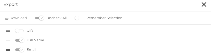 You can then choose to download the UID, Full Name and/or Email address. You can un-toggle any option that you do not wish to include in your CSV download.