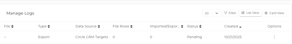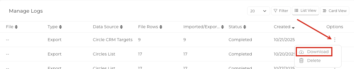 You will now be taken to the Log page and once the export it ready you can click the three dot options menu to download you Circle List.