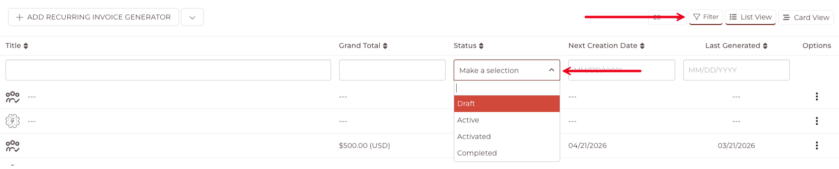 - Review the Recurring Generators list regularly and filter by Completed to keep your list tidy and confirm expected generators have stopped as planned