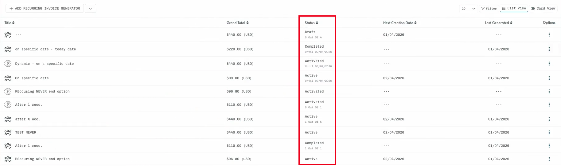 When a generator hits its end condition — either the occurrence count is reached or the end date has passed, it is automatically set to Completed status. No further Invoices will be generated.