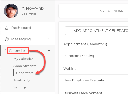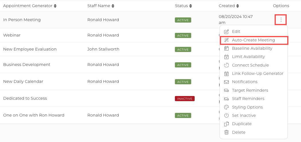 Click Options (3 dots) beside the Appointment Generator of your choice and select Auto-Create Meeting.