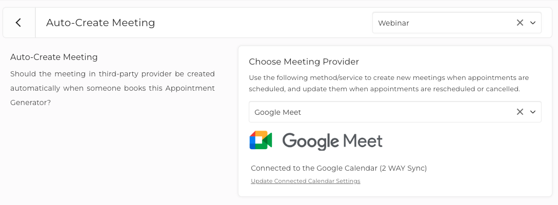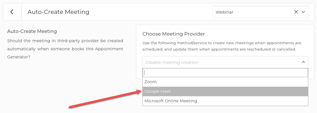 Under Choose Meeting Provider select Google Meet from the dropdown menu.