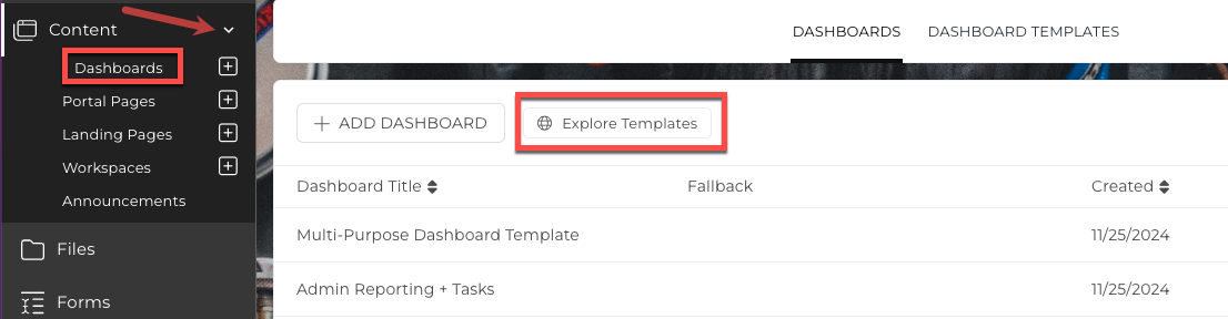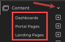 Dashboards, Portal Pages and Landing Pages are all created by going to Content in the side menu and selecting the relevant page type.