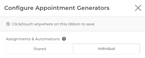 If Individual is selected any shared or Choice Block Assignments and Automations will be removed and you will add them via the gear icon located next to each Appointment Generators you add to the form (More information about Form Assignments and Automations is shown later).