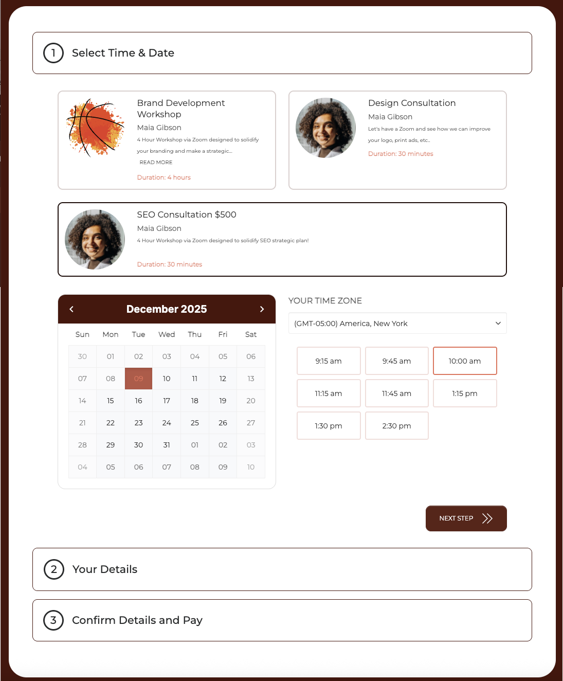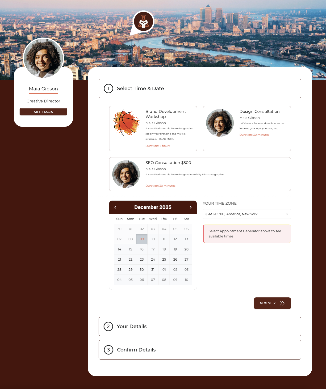 When the Contact selects the Appointment Generator and Date, all available Times for that day will be shown. They then can select their preferred Time and click NEXT STEP to move to step 2.