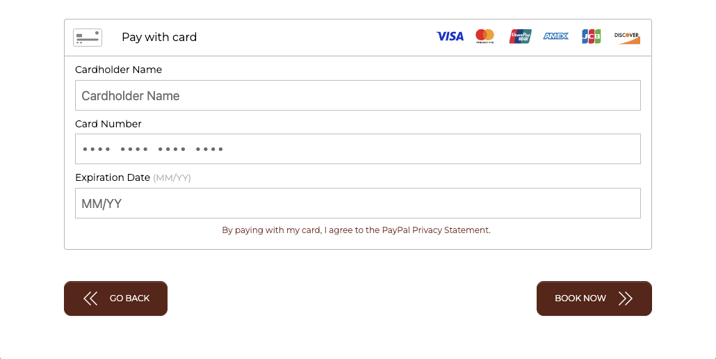 The Target can then add their Credit Card details and click the BOOK NOW button to finalize the payment.
