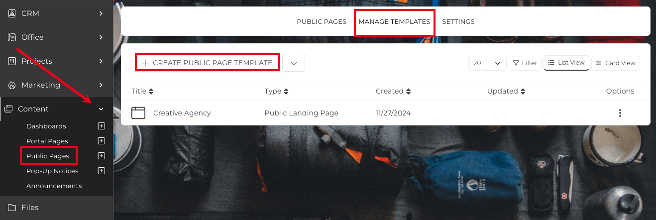 Navigate to Content > Public Pages > Manage Templates, and click the +Create Public Page Template button.