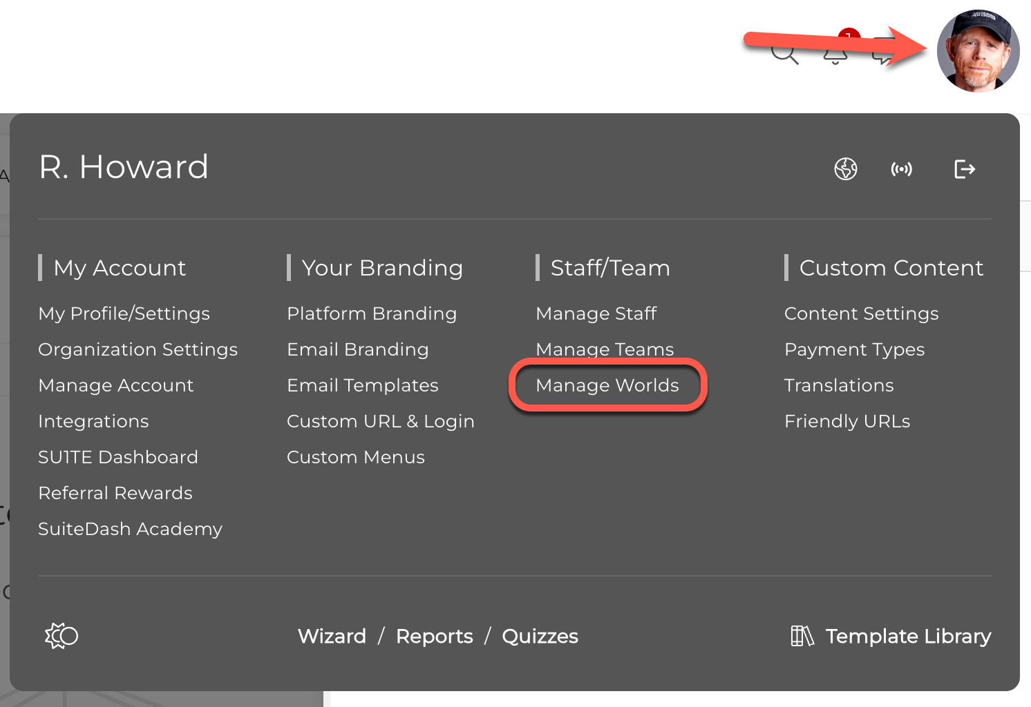 To add Staff members to a WORLD you can add the World to the Staff person's Profile or you can go to Flyout Menu > Manage Worlds and click the WORLD you want to add Staff to and select Add Members.