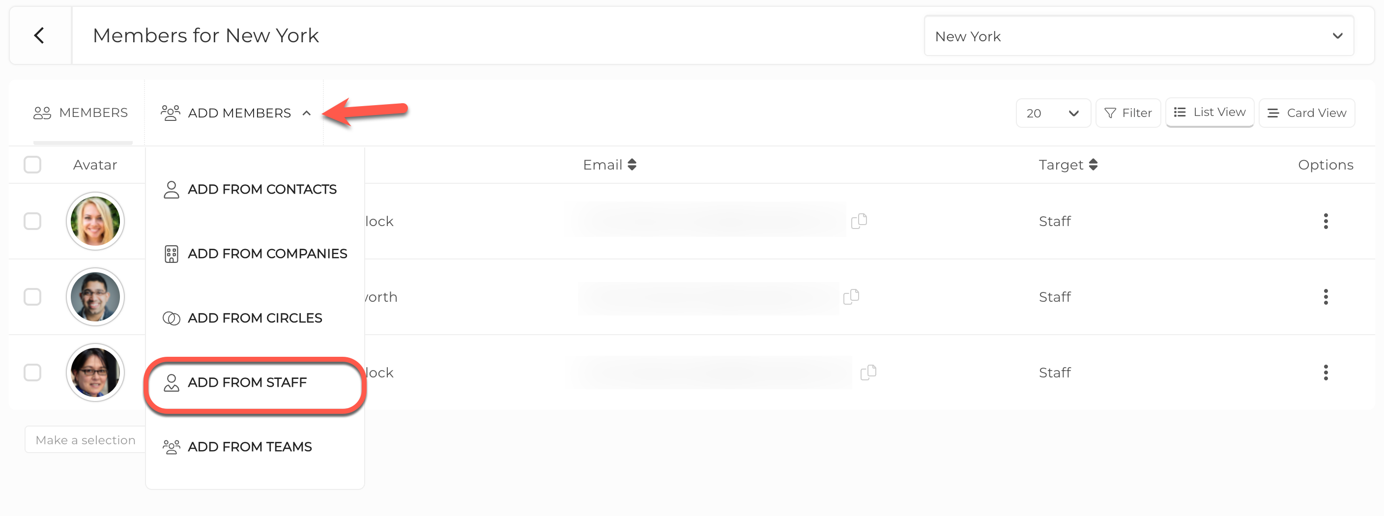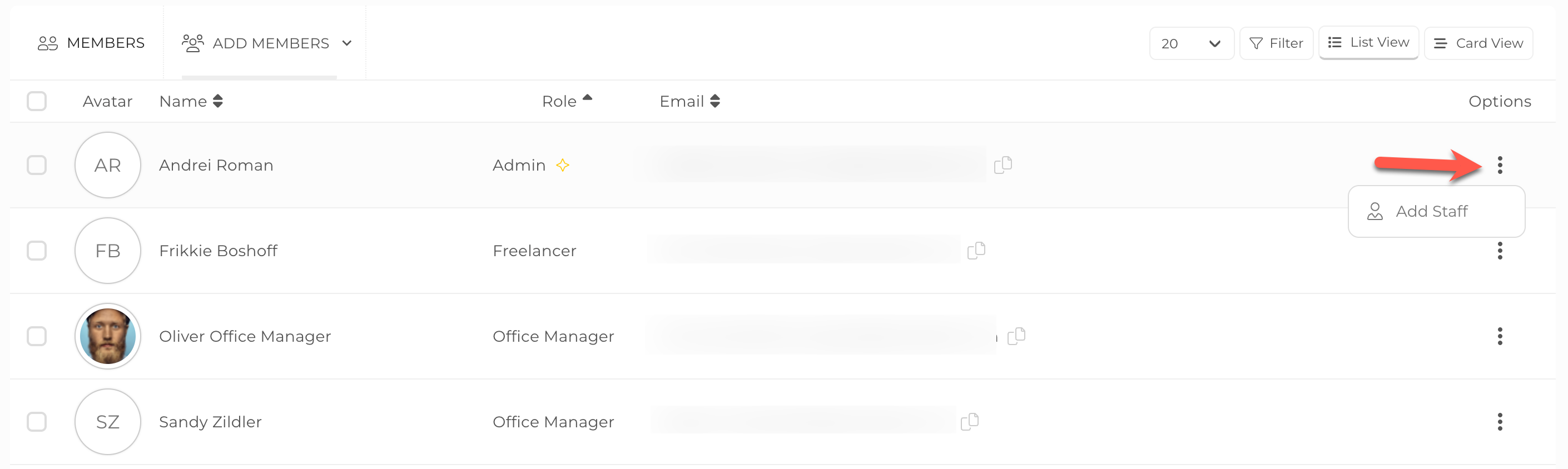 When you click Add From Staff, your staff list will load on the page. To add a single staff member, click the three-dot options menu next to the staff member and select Add Staff.