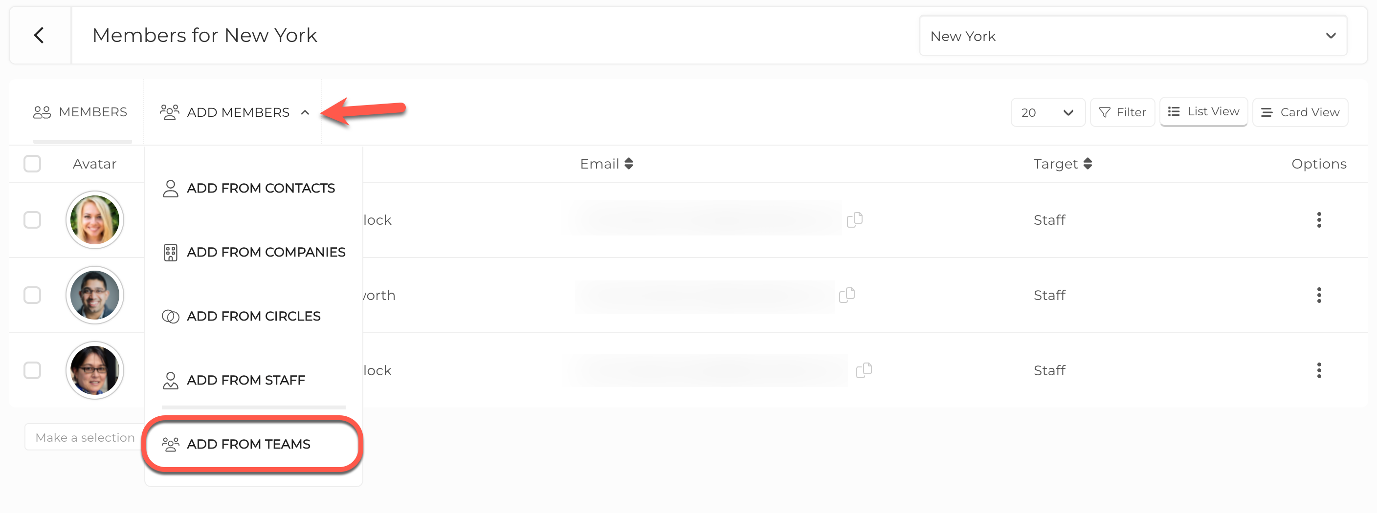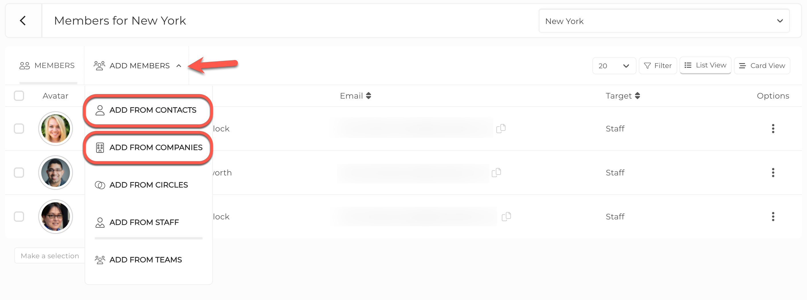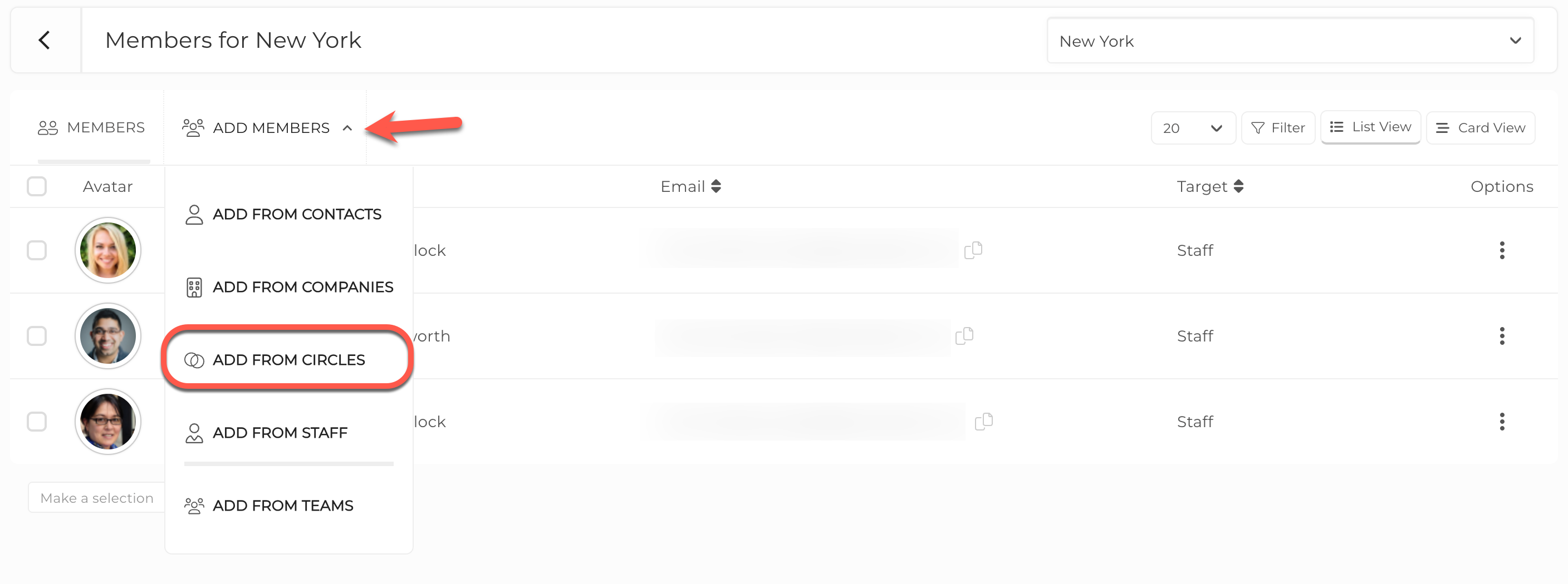 When you click Add From Circles, your Circle list will load on the page. To add a single Circle, click the three-dot options menu next to the Circle and select Add Circle.