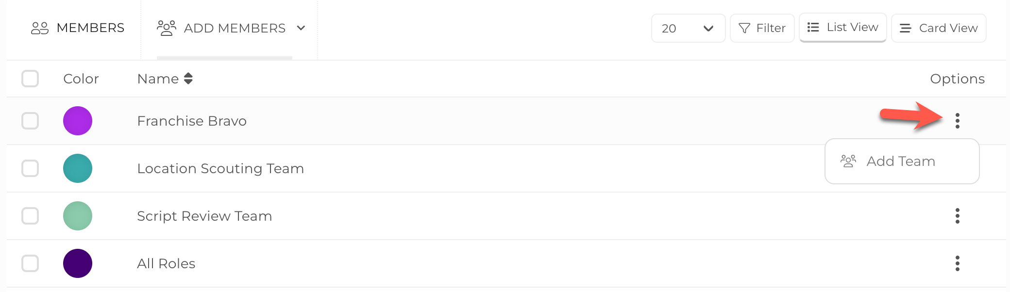 When you click Add From Teams, your teams list will load on the page. To add a single team, click the three-dot options menu next to the team and select Add Team.