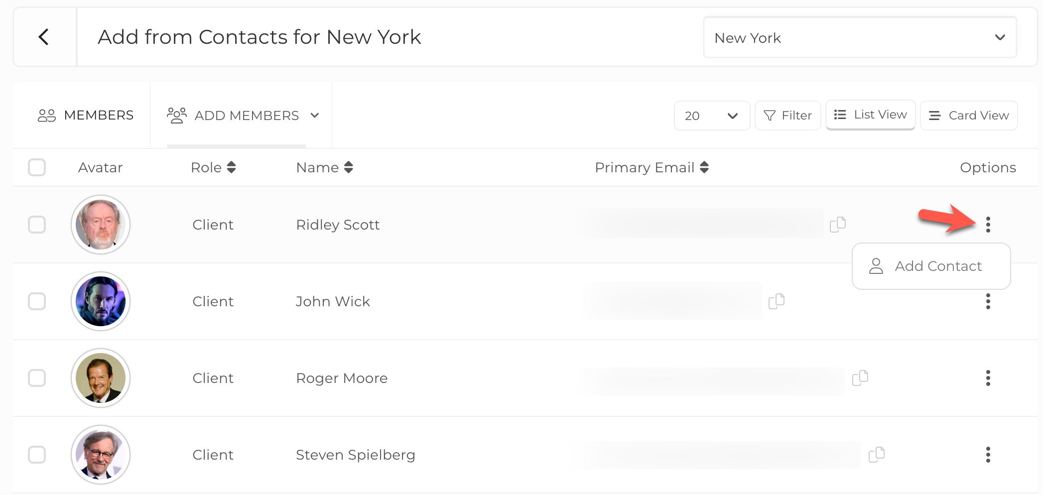 When you click Add From Contacts or Add From Companies, your CRM list will load on the page. To add a single Contact or Company, click the three-dot options menu next to the entry and select Add Contact or Add Company.