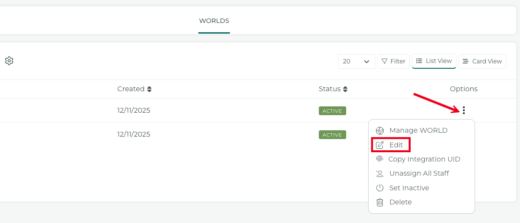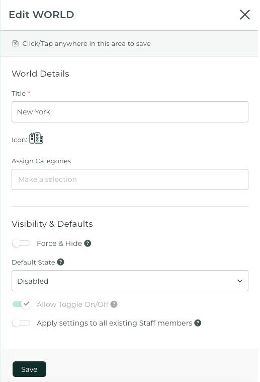 Force & Hide: When enabled, the WORLD is active for the assigned staff and will be hidden from the WORLDs list.